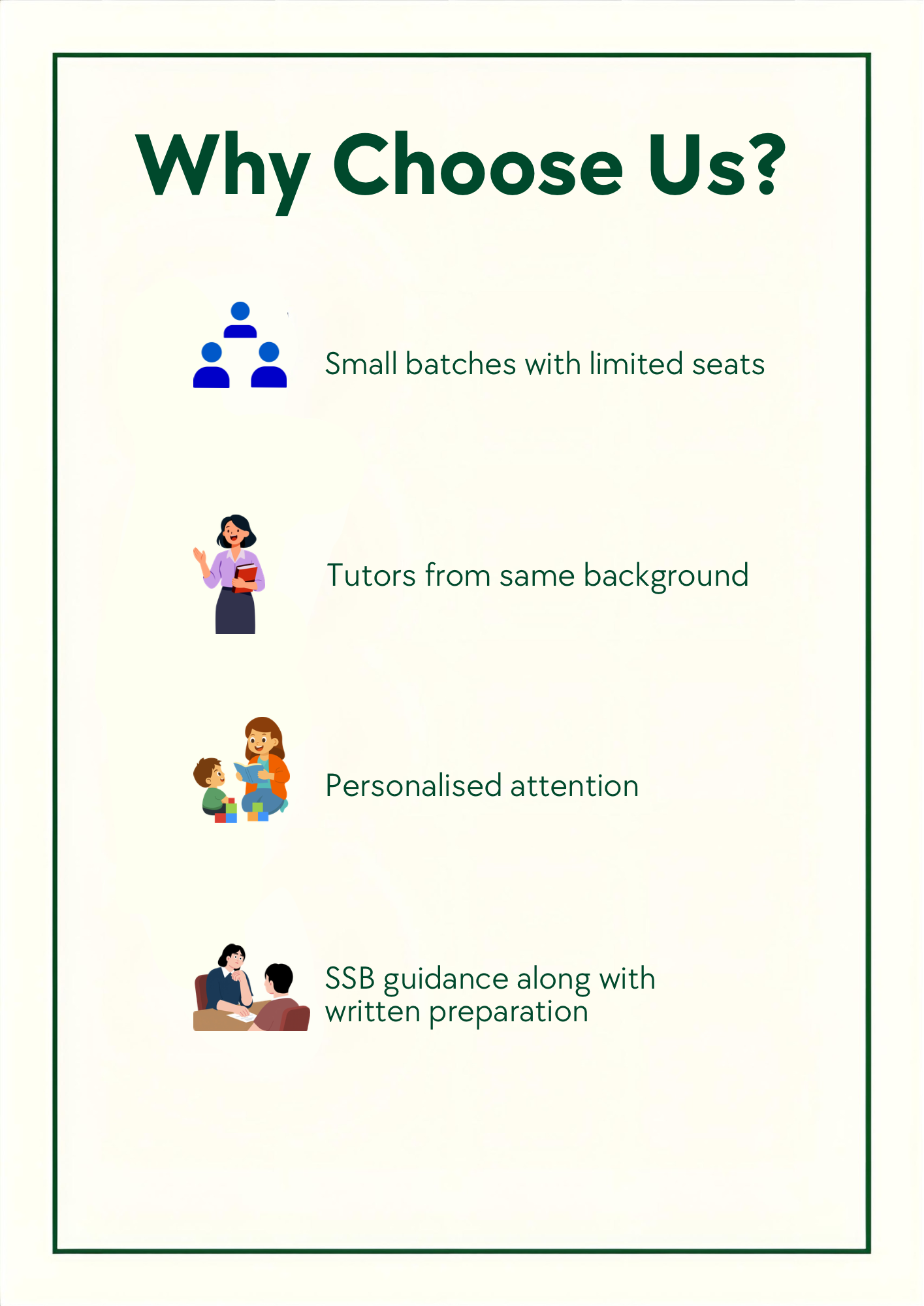 Yes you heard it right, along with written prep we also guide for SSB on a daily basis to our batch students to improve their habits and personality alongside.